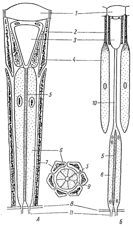 В последнее время показано (Грибакин, 1967), что ретинула аппозиционного (или фотопического) глаза пчелы Apis mellifera включает в себя клетки трех типов, отличающиеся площадью поперечного сечения рабдомеров,. диаметром микровилл, а также глубиной расположения ядра. Эти типы клеток воспринимают разную длину излучения, т. е. обусловливают цветовое зрение пчелы. Однако даже электронный микроскоп не позволяет пока увидеть пути синтеза зрительного пигмента в клетке, изучить его локализацию. Более того, изучение зрительных пигментов насекомых сильно осложнено по меньшей мере двумя причинами. Во-первых, структуры, содержащие зрительный пигмент, находятся в центре (точнее, в глубине) каждой ретинулы, что затрудняет получение фракций рабдомеров с помощью методов, которые обычно применяются биохимиками для получения фракций наружных сегментов сетчатки позвоночных. Во-вторых, изучение изолированных препаратов глаза осложняется наличием в каждом омматидии плотного пигментного чехла и оптической «пробки», закрывающих проксимальный конец рабдома.
