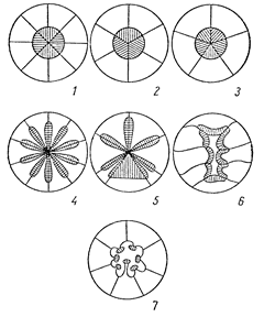 В настоящее время ведутся дискуссии о том, что является функциональной единицей сложного глаза – омматидий или отдельная ретинулярная клетка (см., например: Goldsmith, 1964). В пользу второго предположения говорит тот факт, что клетки сложного глаза различаются не только по спектральной чувствительности и реакции на положение плоскости поляризации падающего света (Goldsmith, 1964; Мазохин-Поршняков, 1965; Shaw, 1966, 1967), но и по своим морфологическим характеристикам (рис. 6 ). Так, например, из электронных микрофотографий Фернандес-Морана (Fernandez-Moran, 1958) видно, что ретинула суперпозиционного (или скотопического) глаза ночной тропической бабочки Erebus odora содержит семь рабдомеров, один из которых резко отличается от остальных значительно большей площадью поперечного сечения. Возможно, клетка, образующая этот рабдомер, имеет и наибольшую светочувствительность (по сравнению с остальными клетками, входящими в ретинулу).