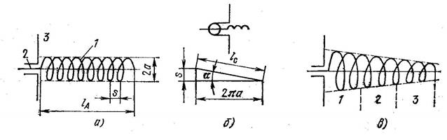 . Эта полоса может быть значительно расширена путем перехода к конической антенне (рис, 1, б), в которой участок (2) со средней длиной витка