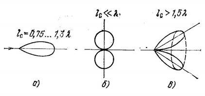 , то на одном витке спирали укладывается две, три и более волн, а это приводит к наклонному излучению и конусной форме пространственной ДН (рис. 3, в).
