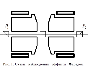 Принципиальная схема устройства для наблюдения и многих применений эффекта Фарадея показана на рис. 1. Схема состоит из источника света, поляризатора, анализатора и фотоприемника. Между поляризатором и анализатором помещается исследуемый образец. Угол поворота плоскости поляризации отсчитывается по углу
