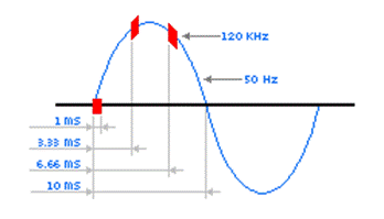 Импульсы представляют собой пакеты переменного напряжения амплитудой 5В, частотой 120 КГц и длительностью 1 мс, что определяет бинарную единицу (единичный бит); бинарный ноль - отсутствие импульса. Передача импульсов синхронизирована с переходом переменного тока через нулевой уровень в пределах 200мкс интервала.