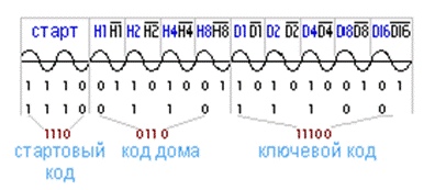 Стартовый код - это уникальный код, всегда равный 1110 и не имеющий дополняющих бит в смежных полупериодах, т.е. значащие биты передаются на каждый переход силового напряжения через нуль.