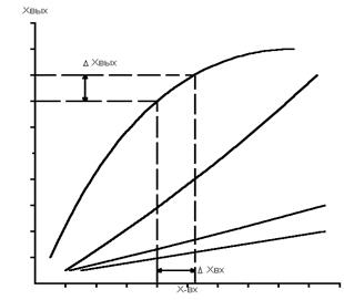 Зависимость выходной величины от входной величины в установившемся режиме называется статической характеристикой ОР. Статические характеристики могут быть как линейными, с различными коэффициентами наклона, так и нелинейными, при чем большинство реальных объектов в целом имеют нелинейные.