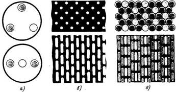 Теневая маска, выполненная из стального листа сферической формы толщиной 0,15 мм, располагается в непосредственной близости от экрана. В кинескопах с дельтаобразным расположением ЭОП такая маска имеет круглые отверстия, а в кинескопах с самосведением – продолговатые отверстия – щели (см. рис.1, б).
