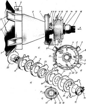 Для устранения перекрещивания боковых лучей необходимо отпустить регулировочные винты 21 и 23 на фланце хвостовика (см. рис.10, б, в). При этом винт 8 на горизонтальной оси должен быть затянут.