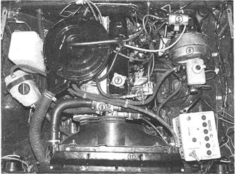 Расположение ОСНОВНЫХ агрегатов. В МОТОРНОМ Отсеке: 1 - труба подвода охлаждающей жидкости к радиатору; 2 - воздушный фильтр; 3 - крышка головки блока цилиндров; 4 - датчик-распределитель; 5 - катушка зажигания; 6 - вакуумный усилитель тормозов; 7 - пробка маслоналивной горловины; 8 - топливный фильтр тонкой очистки; 9 - термостат 10 — кожух радиатора 11 — радиатор