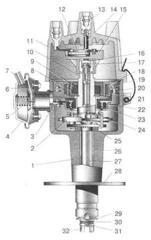 1 - корпус; 2 - грузик центробежного двигателя; 3 - винт крепления подшипника; 4 - вакуумный регулятор; 5 - пружина вакуумного регулятора; 6 - диафрагма; 7 - штуцер; 8 - магнитопровод ротора;9 - постоянный магнит ротора; 10 - ротор; II - крышка; 12 – помехоподавительный резистор; 13 - центральный вывод; 14 - центральный контакт; 15 - бегунок;16 - фильц; 17 - винт крепления ротора; 18 - обмотка статора; 19 - винт крепления статора; 20 - статор; 21 – магнитопровод обмотки статора; 22 - опора статора;23 - подшипник; 24 - пружина грузика; 25 - упорные шайбы; 26 - втулка;27 - валик; 28 - октан-корректор; 29 - упорная шайба;30 – стопорное кольцо; 31 - штифт; 32 - муфта привода.
