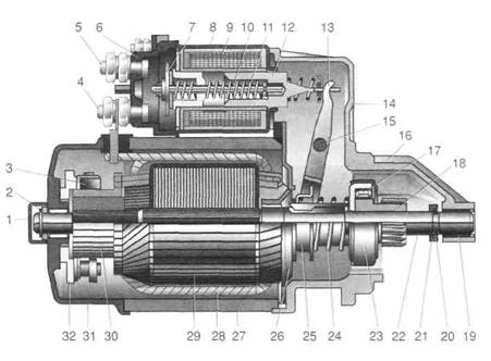 Стартер: 1 - колпак защитный; 2 - шайба запорная; 3 - щетка; 4,5 - выводы; 6 - крышка тягового реле; 7 - контактная пластина; 8 - тяговое реле; 9 - обмотка реле; 10 - шток; 11 - возвратная пружина; 12 - сердечник; 13 - рычаг; 14 - крышка; 15- ось рычага; 16- удлинитель крышки; 17- ролик; 18 - ведущая (приводная) шестерня; 19 - втулка; 20 - кольцо пружинное; 21 - втулка упорная; 22 - вал; 23 - обгонная муфта; 24 - пружина; 25 - полумуфта включения; 26 - опора промежуточная; 27-статор; 28 - обмотка статора; 29 - ротор (якорь); 30 - коллектор; 31 - крышка; 32 - щеткодержатель.