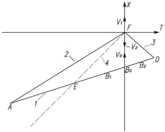 Пусть в СОФВ одновременно с приходом второго объекта в точку F первый объект приходит в точку B0, а собственное время движения второго объекта из точки A в точку F равно Δt1. Тогда промежуток космологического (абсолютного) времени, соответствующий этому собственному времени и отсчитываемый в СОФВ от момента прихода первого объекта в точку B0, а второго – в точку F, будет равен: TA = –Γ1Δt1, где Γ1 = (1 – V12)–1/2. В зависимости от величины в точке F абсолютной скорости Vi второго объекта промежутки космологического времени между событиями в точке Bi на первом и в точке F на втором объектах, являющимися одновременными (Δt = 0) в ИСО второго объекта, будут равны: δTi = ΓiVi · xBi, где: xBi – наблюдаемая в ИСО второго объекта координата положения первого объекта. Таким образом, при разных значениях в точке F абсолютной скорости второго объекта одновременными событию в точке F его СО будут события, соответствующие не одному и тому же положению XBi = Γi · xBi в мировом пространстве первого объекта.