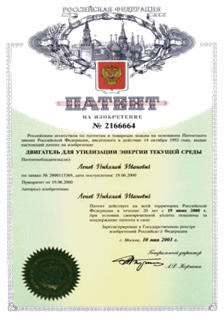 В Патенте предлагается оригинальный, ранее не использовавшийся ни в одной из существующих конструкций, способ использования энергии как водного потока любого вида (рек, ручьёв, приливов, морской волны и т.д.) так и движения воздушных масс. При этом используется естественный поток, без предварительного преобразования (строительства дамб, каналов, напорных труб).