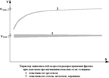 График зависимости скорости распространения упругих колебаний от толщины прозвучиваемых пластин из оргстекла, показанный на рисунке (график 1), свидетельствует о том, что скорость распространения упругих колебаний в оргстекле действительно одинакова во всех точках этого однородного материала. Утолщение линии этого графика при уменьшении толщины пластины соответствует увеличению относительной погрешности определения скорости с уменьшением величины