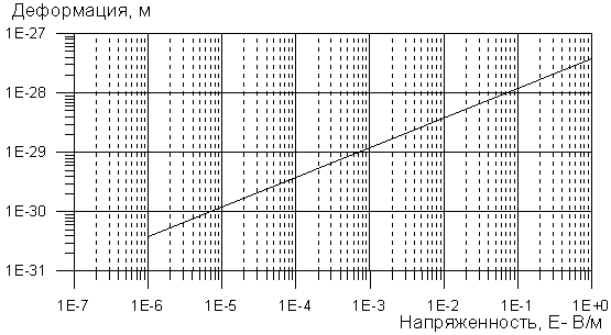 Далее мы вступаем в зону незнания. Какие напряжённости управляют процессами мышления? Образами? Двигательной деятельностью? На эти вопросы могут ответить только биологи, которые исследуют электрические процессы в живых организмах. В данном случае автор выступает только как физик. Можно, например, предположить, что мыслительные напряжённости обладают величинами порядка микровольт, а максимум – около одного вольта. Рассчитаем график деформации структуры вакуума в зависимости от электрической напряжённости, воспользовавшись формулой (1). На рис. 1 дан график расчёта. Напомним, что при земной гравитации деформация примерно на 5 порядков больше максимальной величины на нашем графике и составляет 1,27·10–22 м, для Солнца 6,7·10–22 м. Для того, чтобы поднять какой-либо предмет, пусть даже очень легкий, необходимо в 100 000 раз сильнее «подумать» – создать мысль с такой напряжённостью. Чтобы сдвинуть лёгкую бумажку с малым весом и соответственно с малым трением (по гладкой поверхности опоры), потребуются во много раз меньшие напряжения и мысленные усилия.