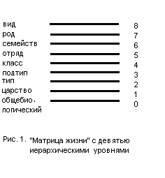 Матрица представляет собой довольно простую схему, состоящую из ряда расположенных друг над другом горизонтальных линий, каждая из которых является неким интегральным показателем свойств какого-либо вида живых существ, связанных с его таксономическим положением. Нулевой уровень характеризует свойства общебиологического характера, первый – свойства, характеризующие то царство, к которому принадлежит рассматриваемый нами вид, второй уровень – свойства типа, третий – подтипа и т.д., вплоть до последнего уровня, в котором отражены видовые свойства (рис.1).