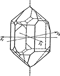 Одна из этих осей - Z соединяет вершины пирамид. Три другие X1, Х2, Х3 перпендикулярны к оси Z и соединяют противолежащие ребра шестигранной призмы. Направление, определяемое осью Z, пьезоэлектрически неактивно: при сжатии или растяжении по этому направлению никакой поляризации не происходит. Напротив, при сжатии или растяжении в любом направлении, перпендикулярном к оси Z, возникает электрическая поляризация. Ось Z называется оптической осью кристалла, а оси X1, Х2, Х3 - электрическими или пьезоэлектрическими осями.