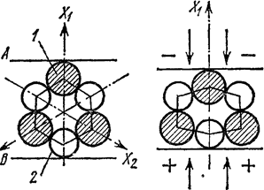 Рис. 3 качественно поясняет возникновение пьезоэлектрического эффекта в кварце. Здесь схематически показаны проекции положительных ионов Si (заштрихованные кружки) и отрицательных ионов О (светлые кружки) в плоскости, перпендикулярной к оптической оси Z. Этот рисунок не соответствует фактической конфигурации ионов в элементарной ячейке кварца, в которой ионы не лежат в одной плоскости, а их число больше показанного. Он, однако, правильно передает симметрию взаимного расположения ионов, что уже достаточно для качественного объяснения.