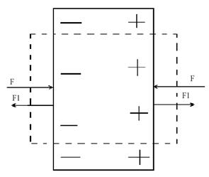 Легко видеть, что необходимость существования обратного пьезоэффекта следует из закона сохранения энергии и факта существования прямого эффекта. Рассмотрим пьезоэлектрическую пластинку (рис. 5) и предположим, что мы сжимаем ее внешними силами F. Если бы пьезоэффекта не было, то работа внешних сил равнялась бы потенциальной энергии упруго деформированной пластинки. При наличии пьезоэффекта на пластинке появляются заряды и возникает электрическое поле, которое заключает в себе дополнительную энергию. По закону сохранения энергии отсюда следует, что при сжатии пьезоэлектрической пластинки совершается большая работа, а значит, в ней возникают дополнительные силы F1, противодействующие сжатию. Это и есть силы обратного пьезоэффекта. Из приведенных рассуждений вытекает связь между знаками обоих эффектов. Если в обоих случаях знаки зарядов на гранях одинаковы, то знаки деформаций различны. Если при сжатии пластинки на гранях появляются заряды, указанные на рис. 5, то при создании такой же поляризации внешним полем пластинка будет растягиваться.