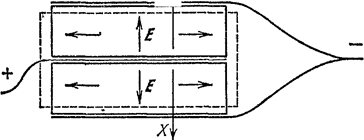 На рис.6 показан двойной пьезоэлемент (составленный из двух пластинок), работающий на сжатие. Пластинки вырезаны из кристалла таким образом, что они одновременно либо сжимаются, либо растягиваются. Если, наоборот, сжимать или растягивать такой пьезоэлемент внешними силами, то между его обкладками появляется напряжение. Соединение пластинок в этом пьезоэлементе соответствует параллельному соединению конденсаторов.