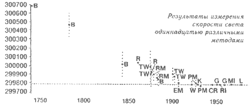 Любопытно, что Майкельсон с помощью одного и того же метода вращающегося зеркала измерял скорость света с 1879 по 1926 год - в течение целых 47 лет. Его результаты показывают устойчивое понижение скорости света, в соответствии с результатами других ученых.