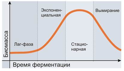 Процесс культивации микроорганизмов – ферментация – начинается с того момента, когда заранее подготовленный посевной материал вводится в реактор. Размножение культуры микроорганизма характеризуется четырьмя временными фазами[4] : лаг-фаза; экспоненциальная; стационарная; вымирание.