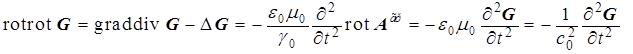 Как видим, представленные в системе (8) уравнения (8а) и (8c) в совокупности структурно являются первичными уравнениями гравитационных волн. В этом можно легко убедиться, взяв, как обычно, ротор от одного из роторных уравнений системы, и после чего подставить в него другое роторное уравнение той же системы. Например, в качестве иллюстрации получим волновое уравнение относительно