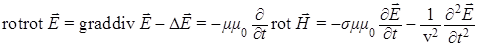 компоненты электромагнитного поля распространяются в пространстве в виде волн. Например, из (1а) и (1в) сравнительно просто получить волновое уравнение для поля электрической напряженности