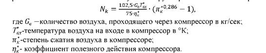 Как видно из формулы (1), мощность, затрачиваемая на работу компрессора, зависит от расхода воздуха через двигатель, степени сжатия воздуха в компрессоре и коэффициента полезного действия. Чем больше расход воздуха через двигатель, степень сжатия воздуха и чем меньше коэффициент полезного действия компрессора, тем большая мощность нужна для вращения компрессора [1].