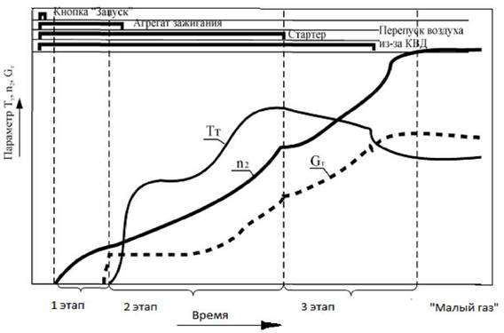 Процесс запуска авиационного ГТД условно может быть разбит на три этапа.