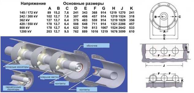 Из представленных данных видно, что радиальный размер оболочки газоизолированных линий в однофазном исполнении для номинального напряжения от 145 до 1200 кВ лежит в диапазоне 240-760 мм, при этом толщина оболочки меняется мало