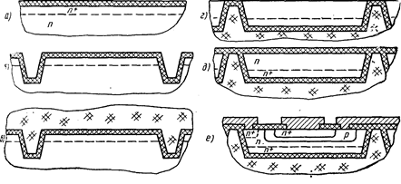 На рис. 3,е представлена изопланарная структура транзистора, в которой донная часть 2 коллектора изолирована от монокристаллической пластины