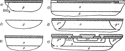 а—исходная пластина; б—стравливание окисла, подготовка поверхности; в—эпитаксиальное наращивание n-слоя, окисление поверхности; г—вскрытие окон в окисле под изолирующую (разделительную) диффузию примеси; д — диффузия акцепторной примеси, окисление поверхности; е — готовая структура после формирования диффузионных базовых и эмиттерных областей, а также получения межсоединений
