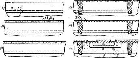 в — избирательное травление нитрида кремния по контуру будущих элементов; г — глубокое окисление кремния; д — стравливание нитрида кремния и окисление поверхности;