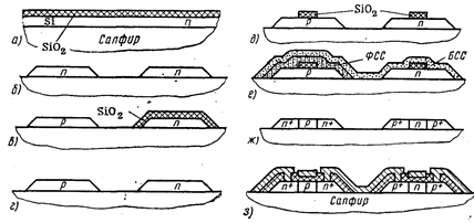 а—исходная пластина «сапфир—эпитаксиальный кремний—окись кремния»; б—избирательное анизотропное травление кремния с помощью оксидной маски (образование островков); в—избирательная диффузия акцепторной примеси; г — снятие маски с островков; д — маскирование островков с помощью SiO2 ; е — избирательное покрытие фосфорсиликатным стеклом (ФСС) р-островков и общее покрытие боросиликатным стеклом (БСС); ж— структура после диффузии примесей и стравливания БСС, ФСС и SiO2, з — готовая структура после нанесения SiO2 и формирования межсоединений