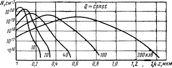 Знак «±» указывают на возможность получения двух переходов на разной глубине, т. е. образования заглубленного (скрытого) слоя. Так, например, при внедрении бора с энергией ионов 160 кэВ и концентрацией Nmax =1018 см-3 в пластину с концентрацией фосфора Nисх =1016 см-3 образуются два перехода на глубине 0,248 и 3,952 мкм. Необходимая при этом доза легирования согласно (2) равна 2,9х1013 см-2 . Решение обратной задачи, т. е. определение энергии ионов, необходимой для образования переходов на заданной глубине, может быть выполнено лишь на ЭВМ с помощью итерационных алгоритмов.