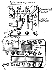 При подгонке конденсаторов необходимо тщательно подбирать режимы обработки во избежание короткого замыкания обкладок. В процессе подгонки выводы подложки устанавливают в контактное приспособление, связывающее элементы схемы с измерительным устройством. Затем, последовательно «опрашивая» элементы, их измеряют и обрабатывают. Для этого каждый элемент схемы должен иметь индивидуальный выход на выводы подложки. При необходимости вводят либо временные (технологические) перемычки, впоследствии удаляемые (рис. 2.50,а), либо временные армированные выводы, которые отрезают после подгонки (рис. 2.50,6).