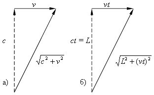В этом опыте, очевидно, свет движется внутри стеклянных стержней. В системе координат, связанной с эфиром, стеклянные стержни движутся в направлении движения интерферометра. Соответственно, и свет, движущийся внутри этих стержней, также смещается в направлении движения интерферометра. В этом случае скорость света, движущегося внутри стержня в перпендикулярном направлении, оказывается равной √(c²–v²), а путь, который проходит каждый импульс света, равным √(L²–(vt)²) (рис.1). Тогда время t движения луча света от полупрозрачного зеркала к отражателю в перпендикулярном направлении оказывается равным L/c, а время T┴ =2t=2L/c.