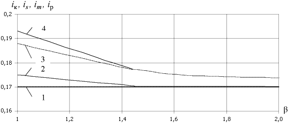 Рис. 2. Зависимость передаточных отношений от коэффициента запаса по сцеплению β: 1– кинематического iк ; 2 – с учетом УГД скольжения is ; 3 – с учетом смещения нескользящей точки im ; 4 – реального iр