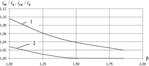 На графике рис.3 приведены зависимости im /iк (кривая 1) и iск /iк (кривая 2) от коэффициента запаса по сцеплению β.