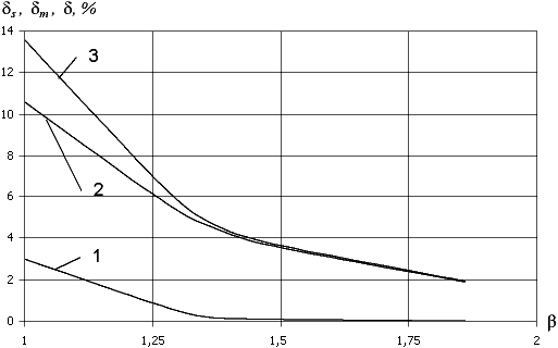 Рис. 4. Зависимость потерь скорости на ведомом звене от коэффициента запаса по сцеплению β: 1 – потери скорости от УГД скольжения δs ; 2 – потери скорости, связанные со смещением нескользящей точки δm ; 3–общие потери скорости δ