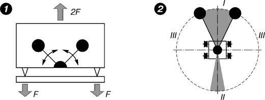 Рис. 2. В тележках В. Толчина грузы ускоряются (зона I), замедляются (зона II) или двигаются по инерции (зона III)