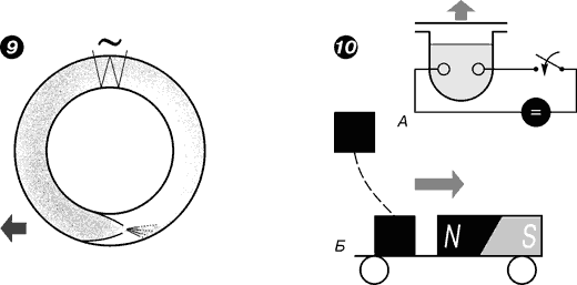Примерно о такой же конструкции говорит Г.Копытов. Если падающий груз притянется магнитом, то, получив импульс, он передаст его тележке (рис.10Б). С той же целью хорошо бы создать колебания среды электрическими разрядами (рис.10А). И все же законы Ньютона, сохранения механического импульса справедливы и для электромагнетизма, хотя здесь еще труднее разобраться в физике процесса.