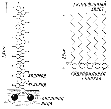 Рис. 1. Молекула стеариновой кислоты – типичная «русалка». При образовании мономолекулярного слоя на поверхности воды гидрофильные головки молекул опущены в воду, а гидрофобные хвосты торчат вертикально над водной поверхностью.