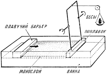 Рис. 2. Ванна и весы Ленгмюра для измерения поверхностного давления монослоя. Под действием внешней силы плавучий барьер движется вправо и сжимает монослой. Давление на поплавок уравновешивается грузом.