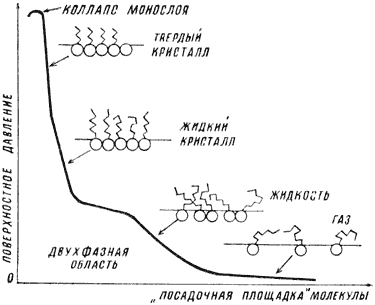 Рис. 3. При увеличении давления на монослой со стороны плавучего барьера можно наблюдать последовательность различных двухмерных фаз. Площадь поверхности, приходящаяся на одну молекулу (посадочная площадка), зависит от того, в какой фазе находится монослой.