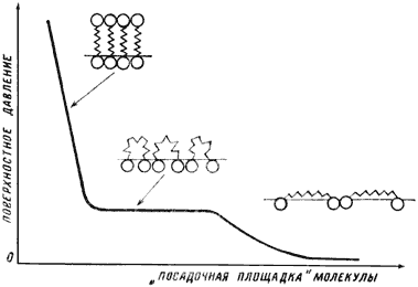 Рис. 4. Посадочная площадка молекул с двумя полярными головками сильно зависит от того, какую конфигурацию приобретает молекула при изменении поверхностного давления. На рисунке показана изотерма для пленки, состоящей из таких молекул (очень похожая на изотерму трехмерного идеального газа, изображающую закон Клайперона – Менделеева). Область плато на изотерме соответствует такой ситуации, когда под действием поверхностного давления молекулы изгибаются дугой, принимая форму арки. При этом их посадочная площадка уменьшается при почти неизменном давлении. При дальнейшем повышении поверхностного давления одна из головок молекулы отрывается от поверхности, и мы приходим к монослою с плотной упаковкой вертикально стоящих молекул. Теперь уже, чтобы хоть немного уменьшить посадочную площадку молекул, требуется очень большое давление.