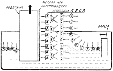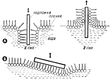 Второй способ предложен Шеффером – тоже учеником Ленгмюра. Подложка ориентируется практически горизонтально и приводится в легкое соприкосновение с монослоем, который удерживается в твердой фазе (рис.5б). Монослой просто прилипает к подложке. Повтором этой операции можно получить мультислой X-типа.