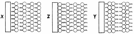 Рис. 6. Многослойные структуры X-, Z- и Y-типов отличаются ориентацией молекул относительно подложки. Структуры X- и Z-типов полярны, так как все молекулы «смотрят» согласованно в одну сторону (хвосты – к подложке или от подложки для X- и Z-типов соответственно). Y-струнтура соответствует неполярной двухслойной упаковке, напоминающей устройство биологической мембраны.
