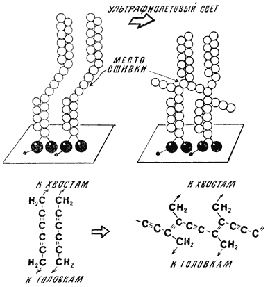 А вот монослой, перенесенный на специальную твердую подложку, можно исследовать как оптическими методами, так и с помощью дифракции электронов. В результате таких исследований выяснилось, что он имеет кристаллическую структуру, однако упорядочение центров тяжести молекул обладает особенностями, характерными именно для двухмерных систем. В частности, в монослое отсутствует истинный дальний позиционный порядок, то есть по мере удаления от какой-то одной выбранной молекулы постепенно накапливается ошибка в позиции других молекул. Чрезвычайно важным оказалось то обстоятельство, что монослой, перенесенный на подложку, наследует тот ориентационный порядок, который был ему навязан поверхностью воды. Все богатство физических свойств и возможностей практического применения ленгмюровских пленок зиждется именно на этом «наследстве». К сожалению, при построении мультислоя из монослоев такое наследство частично может быть утрачено – довольно часто происходит перекристаллизация мультислоя в новую трехмерную кристаллическую структуру. Можно, однако, помешать подобному превращению, если полимеризовать каждый перенесенный монослой. Делается это так: выбираются специальные молекулы с непрочными двойными химическими связями, которые рвутся, например, при действии ультрафиолетового света. Из разорванных внутримолекулярных связей формируются новые, теперь уже межмолекулярные (рис.7), и в результате возникает прочная полимерная сетка, стабилизирующая слоевую структуру.