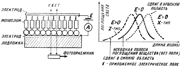 Рис. 8. Мономолекулярный слой можно перенести с поверхности воды на подложку с прозрачным электродом, а затем сверху на монослой нанести еще один электрод. Тогда к монослою можно приложить электрическое поле и наблюдать за сдвигом полос оптического поглощения вещества или измерять туннельный ток во внешней цепи.