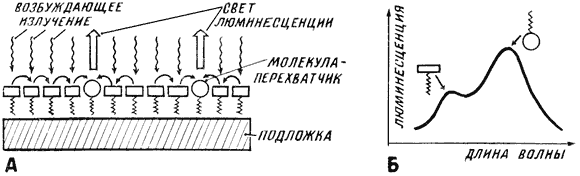 Ленгмюровские пленки можно применить для моделирования эффекта концентрации световой энергии на какой-то избранной молекуле. Например, на начальной стадии фотосинтеза в зеленых растениях свет поглощается молекулами хлорофилла определенного типа. Возбужденные молекулы живут достаточно долго, и само возбуждение может перемещаться по однотипным плотно расположенным молекулам. Такое возбуждение называется экситоном. «Прогулка» экситона заканчивается в момент попадания его в «волчью яму», роль которой играет молекула хлорофилла другого типа с несколько меньшей энергией возбуждения. Именно этой избранной молекуле и передается энергия от многих экситонов, возбужденных светом. Энергия света, собираемая с большой площади, концентрируется на микроскопическом участке – получается «воронка для фотонов». Эту воронку удается смоделировать с помощью монослоя поглощающих свет молекул, в который вкраплено небольшое число молекул – перехватчиков экситонов. После захвата экситона молекула-перехватчик излучает свет с характерным для нее спектром. Такой монослой показан на рис.9а.При его освещении можно наблюдать люминесценцию как молекул – поглотителей света, так и молекул – перехватчиков экситонов. Интенсивность полос люминесценции молекул обоих типов примерно одинакова (рис.9б), хотя их численности отличаются на 2...3 порядка. Это и доказывает, что существует механизм концентрации энергии, то есть эффект фотонной воронки.